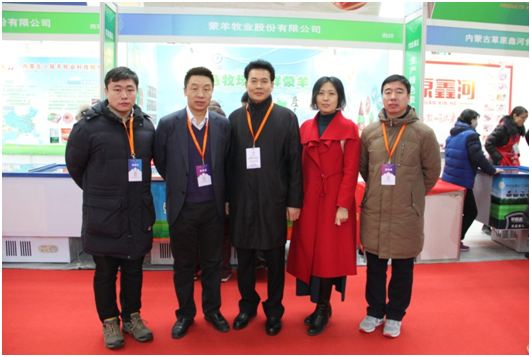 中國農(nóng)業(yè)產(chǎn)業(yè)化龍頭企業(yè)協(xié)會副秘書長李現(xiàn)洲(中)與協(xié)會會長閆樹春、常務(wù)秘書長劉俊青在蒙羊牧業(yè)展位前合影