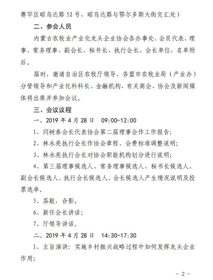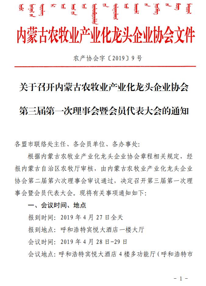 關(guān)于召開內(nèi)蒙古農(nóng)牧業(yè)產(chǎn)業(yè)化龍頭企業(yè)協(xié)會(huì)第三屆第一次理事會(huì)暨會(huì)員代表大會(huì)的通知