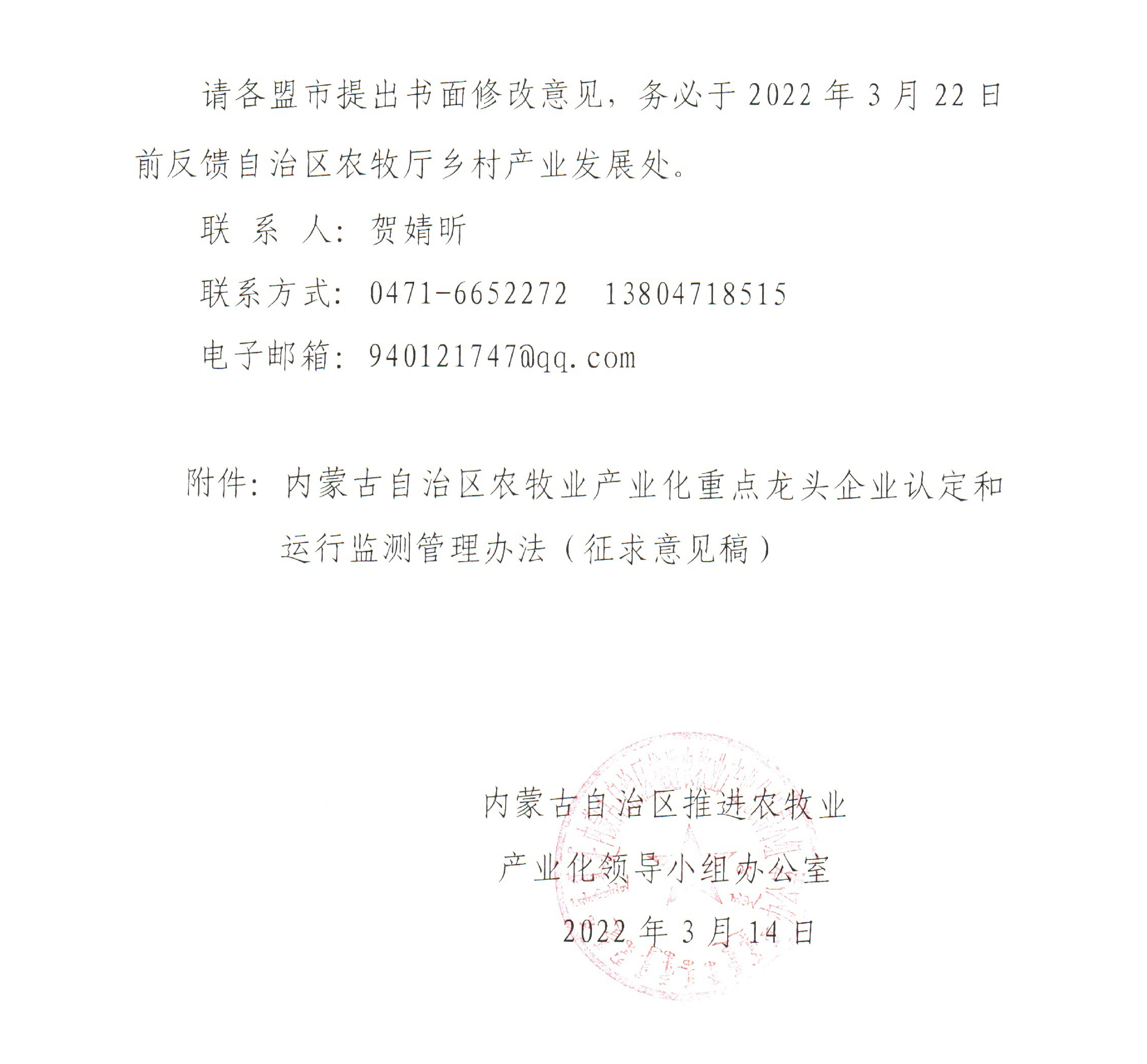 附件:關(guān)于征求修訂《內(nèi)蒙古自治區(qū)農(nóng)牧業(yè)產(chǎn)業(yè)化重點龍頭企業(yè)認(rèn)定和運行監(jiān)測管理辦法(征求意見稿)》修改意見的函