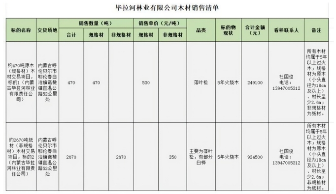 標(biāo)的木材為火燒跡地清理材,分為兩個標(biāo)的,其中標(biāo)的1是約 470 噸的原木(規(guī)格材),標(biāo)的2是約2670噸的紙材(非規(guī)格材)(所有出材以實際出材量為準(zhǔn)),項目明細(xì)如下:
