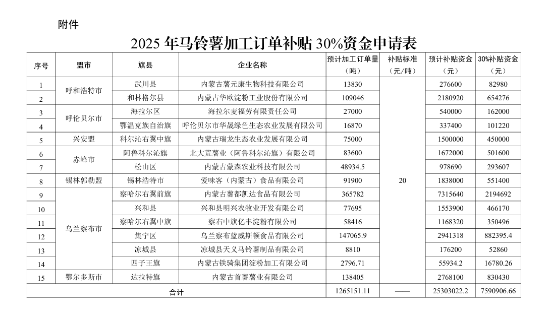 按照《內(nèi)蒙古自治區(qū)農(nóng)牧廳關(guān)于印發(fā)2025年馬鈴薯加工訂單補(bǔ)貼項(xiàng)目實(shí)施方案的通知》(內(nèi)農(nóng)牧加工發(fā)〔2025〕305號)要求,經(jīng)盟市組織申報(bào)、實(shí)地核查、公示,自治區(qū)復(fù)核,現(xiàn)將2025年相關(guān)盟市上報(bào)的馬鈴薯加工訂單補(bǔ)貼30%資金申請情況予以公示,公示期為15天。如對公示有異議,請及時(shí)向自治區(qū)農(nóng)牧廳反映。